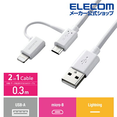 エレコム Lightning変換 アダプタ付 microUSBケーブル スマートフォン用USBケーブル 2in1 microUSB+Lightning 0.3m ホワイト MPA-AMBLAD03WH