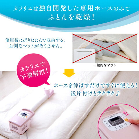 温風でふとんをあたため、湿気をカラッと飛ばしてくれる「ふとん乾燥機カラリエ」冬でもあったかいふとんで寝たい!ふとんの湿気やダニが気になる!外でふとんが干せない! そんな方にオススメです。