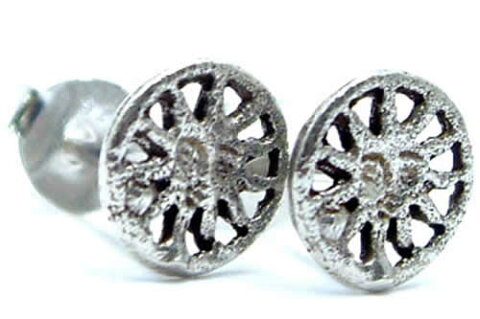 円形のフラットなボディに太陽をモチーフにしたデザインを透かし彫りしたシルバーピアス。