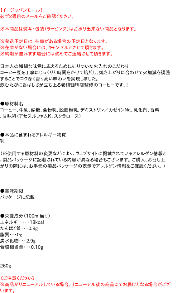 ! ●原材料名 コーヒー、牛乳、砂糖、全粉乳、脱脂粉乳、デキストリン/カゼインNa、乳化剤、香料、甘味料(アセスルファムK、スクラロース) ●本品に含まれるアレルギー物質 乳 (※使用する原材料の変更などにより、ウェブサイトに掲載されているアレルゲン情報と、製品パッケージに記載されている内容が異なる場合もございます。