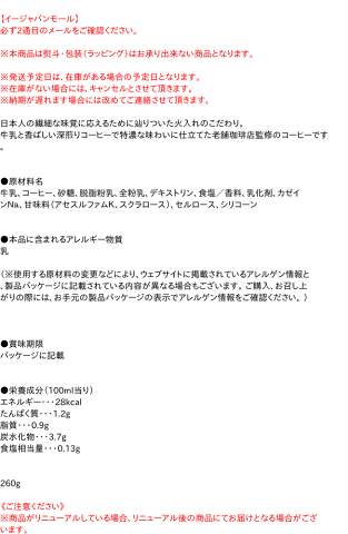 ●原材料名 牛乳、コーヒー、砂糖、脱脂粉乳、全粉乳、デキストリン、食塩/香料、乳化剤、カゼインNa、甘味料(アセスルファムK、スクラロース)、セルロース、シリコーン ●本品に含まれるアレルギー物質 乳 (※使用する原材料の変更などにより、ウェブサイトに掲載されているアレルゲン情報と、製品パッケージに記載されている内容が異なる場合もございます。