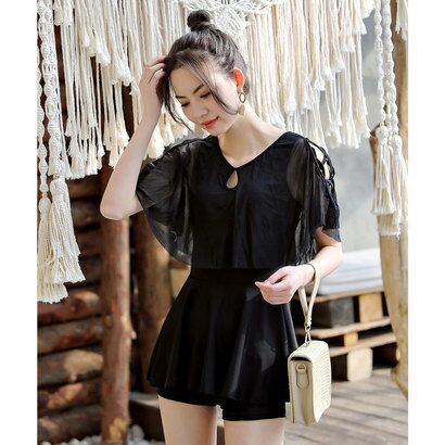 テディショップ teddyshop レディース 肩あきストラッピーワンピース水着 2点セット (プレーンブラック)【返品不可商品】