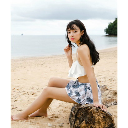 テディショップ teddyshop 水着 ティアードフレアビキニ+ショートパンツ 3点セットアップ (ホワイト×リーフ)【返品不可商品】